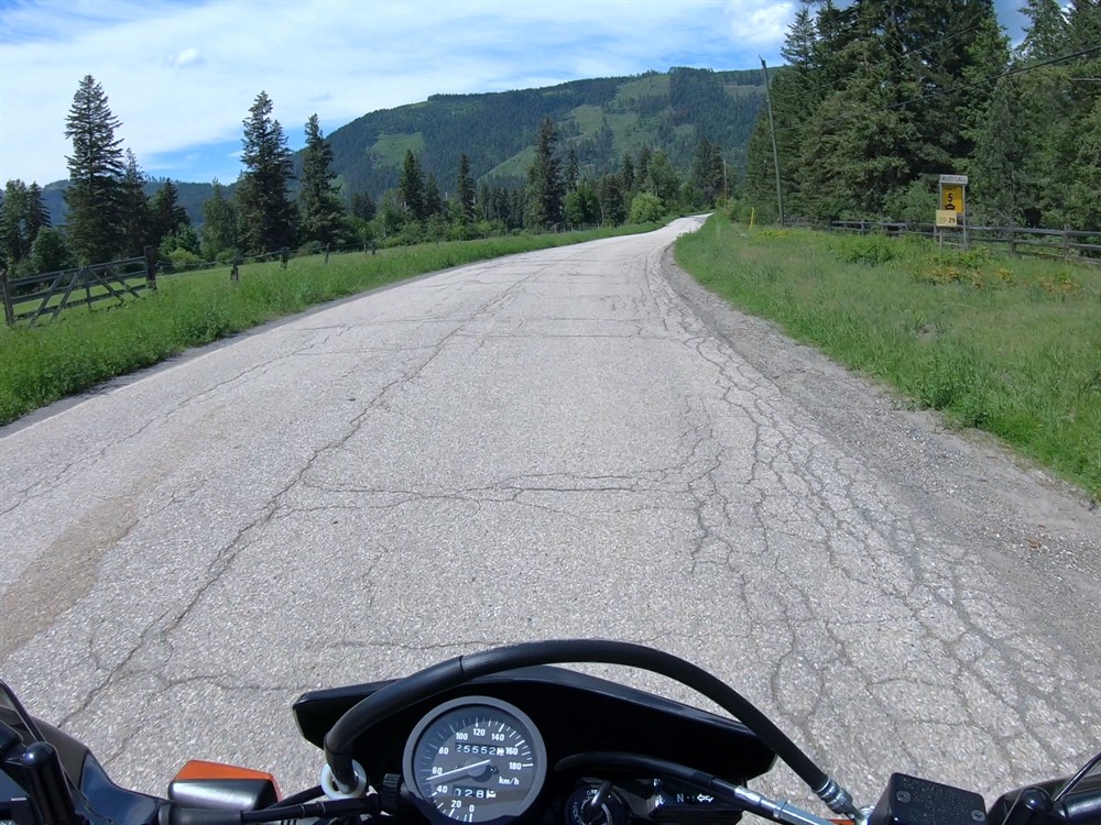 Trinity Valley Road is a scenic backroad ride passable on most motorcycles. The road connects Lumby-Mabel Lake Road with Enderby-Mabel Lake Road. The road surface is mostly hard packed gravel and fairly smooth (almost like pavement in some sections), but there were a lot of small potholes in some parts on my last ride. The first and last few km are paved. Hidden Lake Road is rougher and is best ridden on a dual sport or adventure bike.